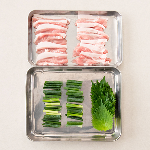 青ねぎは4cm長さに切る。豚薄切り肉は長さを半分に切る。