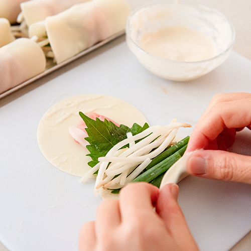 餃子の皮は少し重なるように縦におき、豚薄切り肉をのせて大葉、青ねぎ、もやしを手前に置き、くるくると巻いて巻き終わりを水溶き薄力粉でとめる。