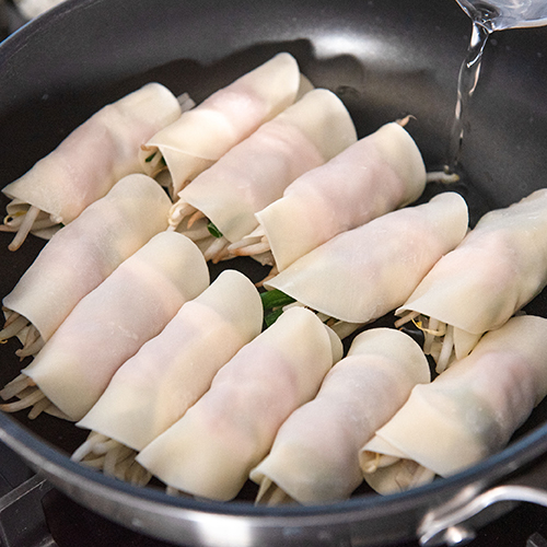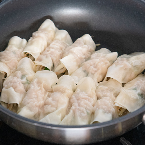 フライパンにサラダ油を馴染ませて②を並べ入れ、中火で熱する。焼き面が白くなってきたら水80ml(分量外)を注ぎ入れ、フタをして中火で約5分蒸し焼きにする。