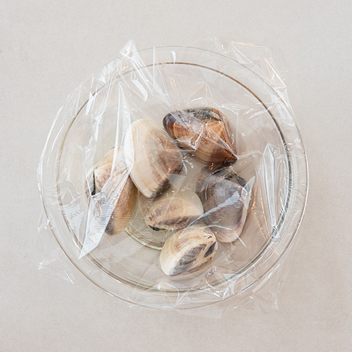 はまぐりはよく洗って耐熱容器に入れる。酒を加えてラップをふんわりとかけてレンジ600Wで4〜5分、口が開くまで加熱する。身を殻から外して蒸し汁は別にしておく。