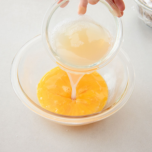 ボウルに「黄身プルンとたまご」を割り入れてカラザを取り除き、卵白のコシを切るようにしっかりと混ぜ、①の蒸し汁と水をあわせて300mlになるように計量して白だしとともに加えて混ぜる。(ここで濾しておくとより滑らかになります) |
