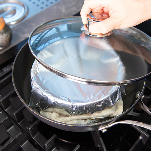 フライパンか鍋に清潔な布巾などを折りたたんで敷き、④を置いて器の高さの1/3まで水(分量外)を注ぎ入れる。蓋をして中火にして煮立ったら弱火で約20分蒸す。