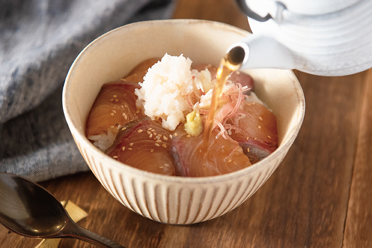 みょうが、わさびなどをトッピングし、ほうじ茶を添える。 |