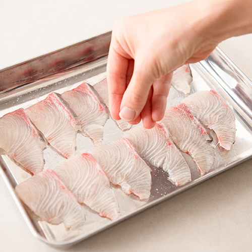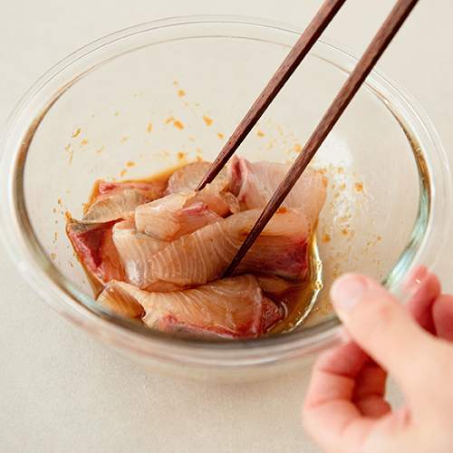 ぶりは削ぎ切りにして塩(分量外)を振って約15分おき、出てきた水分をキッチンペーパーなどで取り除く。