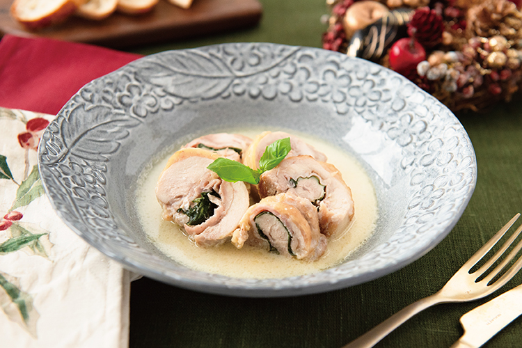 鶏もも肉は厚みを均一にする。塩、こしょうを振る。薄力粉を全体にまぶす。身側に生ハム、バジルの葉をおく。手前から巻き、巻き終わりは楊枝などで