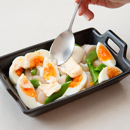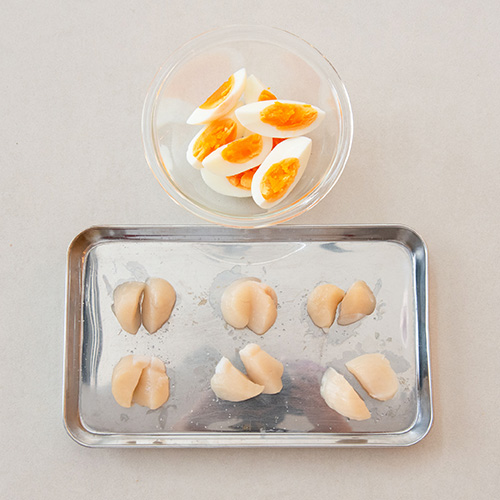 ホタテ貝柱は半分に切って塩少々(分量外)振り、約10分おいて出てきた水分をキッチンペーパーなどで取り除く。ゆで卵は殻を剥き、縦に4等分に切る。