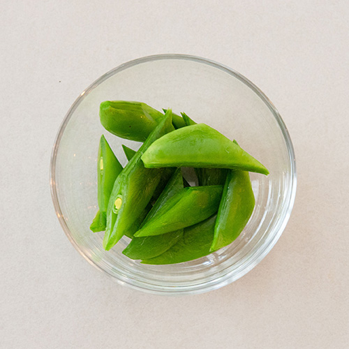スナップエンドウは筋を取り除いてさっと水で濡らし、耐熱皿に並べ、ラップをふんわりとかけてレンジ600Wで約1分加熱する。水にさらして水気を切り、斜め半分に切る。