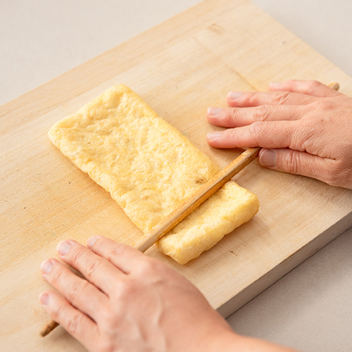 油揚げは菜箸を置いて転がし、縦半分に切って切り口を開く。