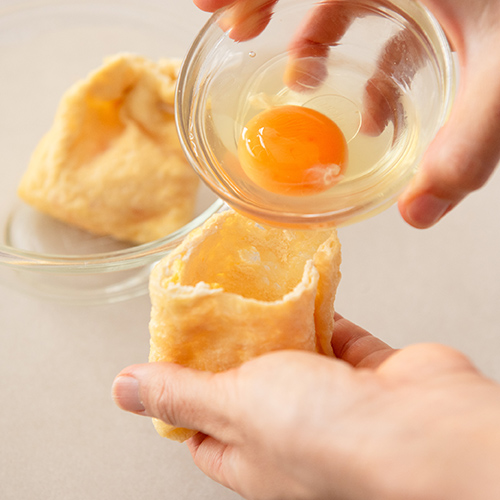 「黄身プルンとたまご」を②に割り落とし、口を楊枝などで留める。