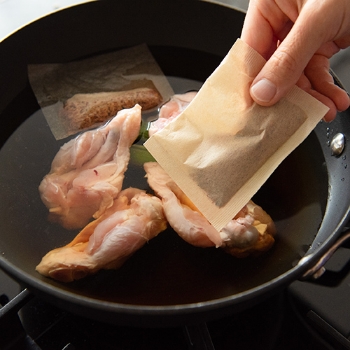 鍋に手羽元、長ねぎの青い部分、しょうが、Aを入れて煮立ったらアクを取り除いて弱火にし、蓋をしないで約5分煮る。