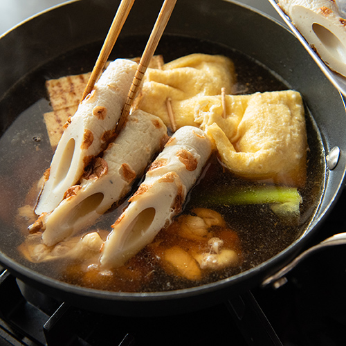 油揚げは途中煮汁に浸っている部分を裏返してさらに5分ほど煮て、お好みで柚子こしょうや辛子を添える。