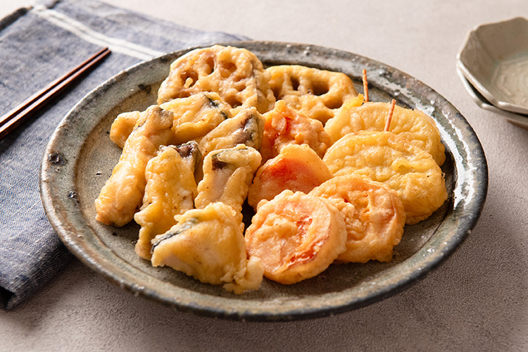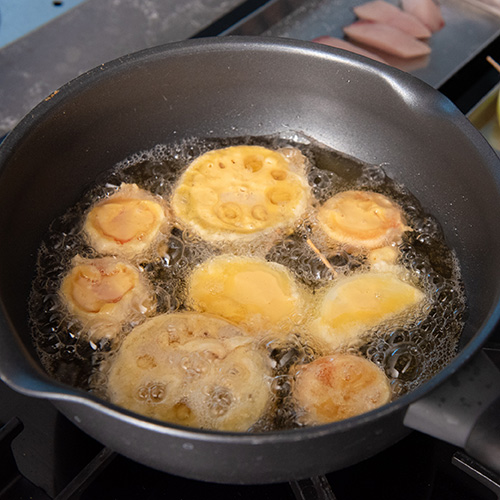 鍋か深めのフライパンに揚げ油を底から1cmほどの高さまで注ぎ入れ、170度〜180度に熱し、Aを混ぜた衣に①、②をくぐらせて揚げる。