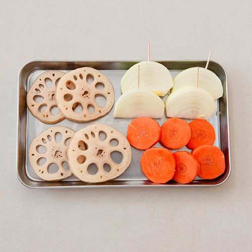 れんこんは皮付きのまま1cm厚さに切り、にんじんは1cm厚さの輪切り、玉ねぎは1cm厚さの半月切りにする。玉ねぎは楊枝を刺してとめておく。